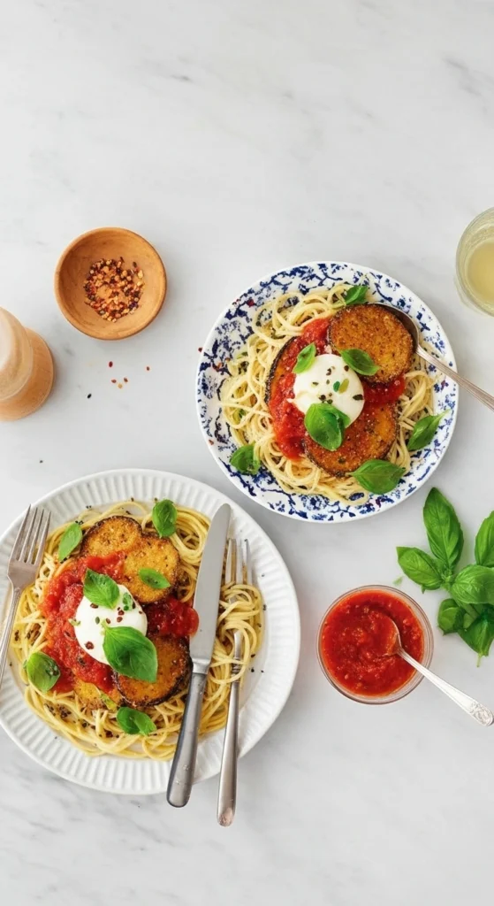 - Transformez l’aubergine en plat complet en la servant avec des pâtes, de la sauce tomate, une cuillerée de crème de cajou, du basilic frais, des flocons de piment rouge et un filet d’huile d’olive.
