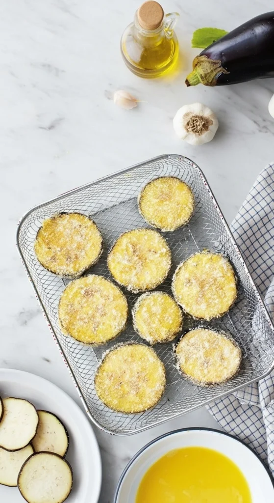 - Ensuite, passez à la cuisson. Arrosez généreusement les tranches d’aubergine panées d’huile d’olive, puis placez-les dans une friteuse à air préchauffée à 190 °C (370 °F).