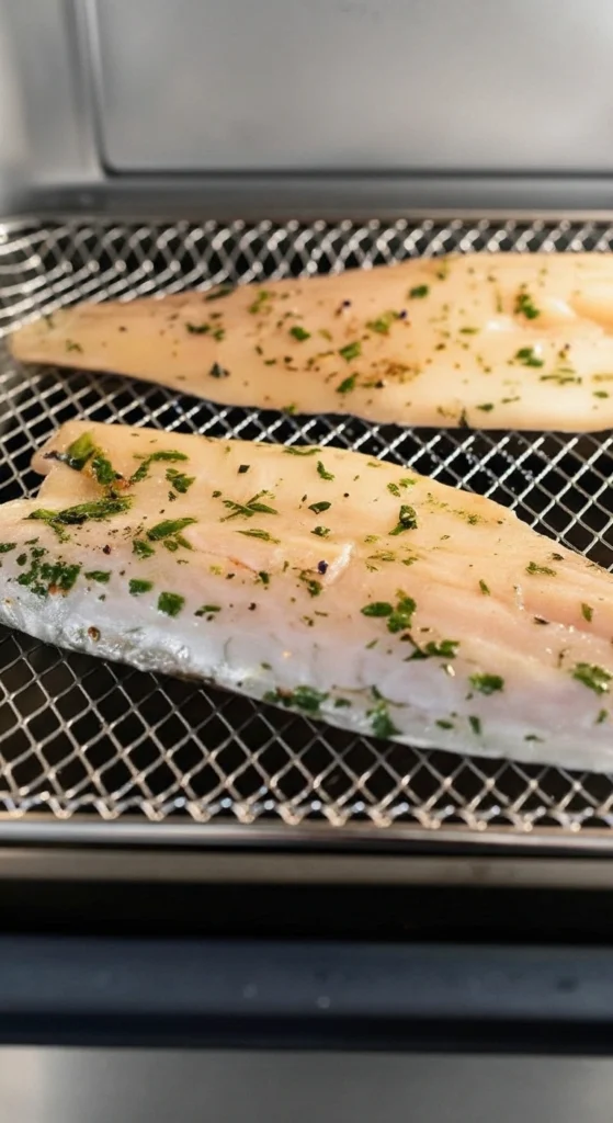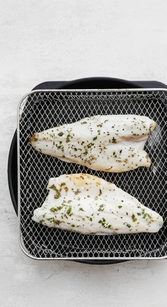 2 : Cuisson à l’Air Fryer : Disposez les filets côté peau vers le bas dans le panier, en laissant un espace entre chaque morceau pour permettre à l’air chaud de bien circuler.