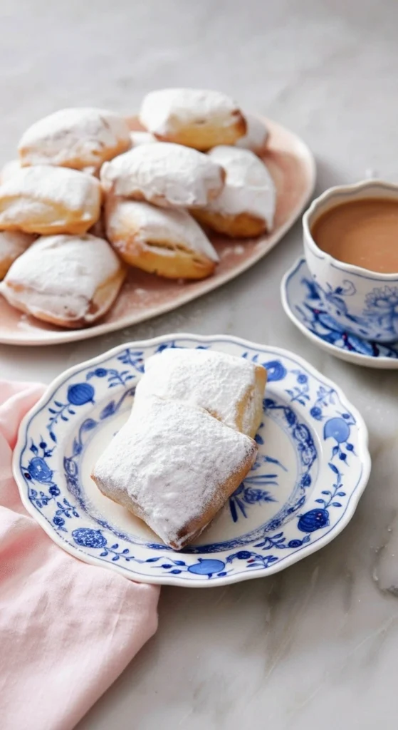 - Sucre glace – utilisé pour saupoudrer les beignets chauds, il leur donne leur aspect emblématique et une touche de douceur finale.