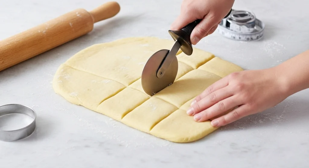 - Découpez la pâte avec une roulette à pizza ou un couteau bien aiguisé. Pas besoin d’outils spécifiques : une simple roulette ou un couteau tranchant permet de découper rapidement les beignets en carrés réguliers.