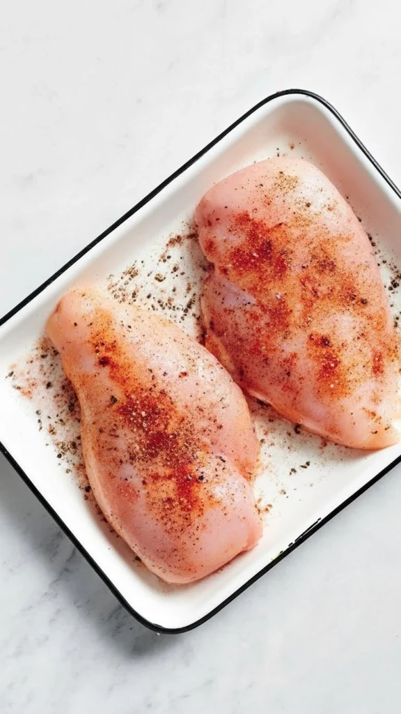 - Étape 1 – Préparation. Enrobez chaque blanc de poulet d’huile d’olive et assaisonnez tous les côtés avec les épices.