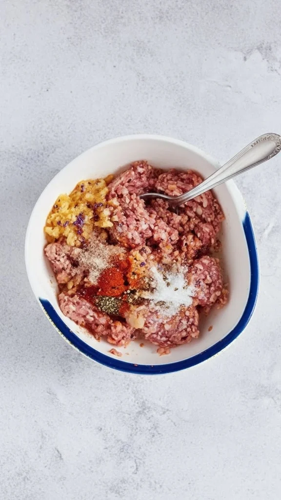 - Dans un grand saladier, ajoutez le bœuf haché, l’oignon râpé, la poudre d’ail, le paprika fumé, le sel, le poivre et la sauce Worcestershire. Mélangez délicatement jusqu’à ce que tous les ingrédients soient bien incorporés, sans trop travailler la viande.