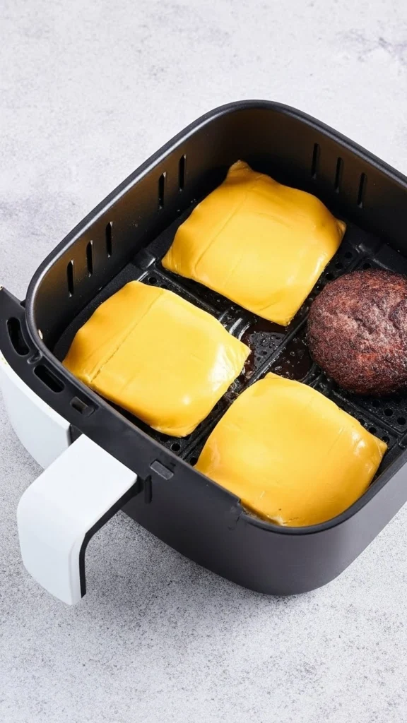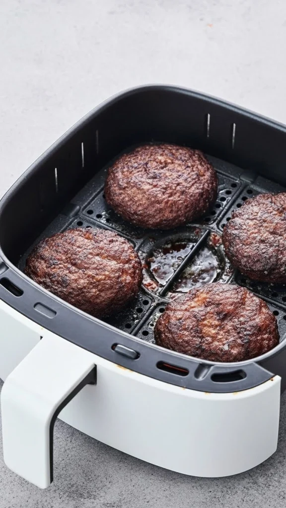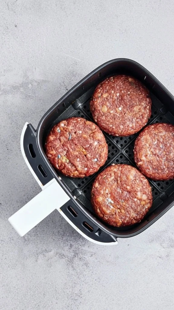 Étape 3 – Faites cuire les steaks de burger à la friteuse à air pendant 4 minutes de chaque côté, jusqu’à ce qu’ils soient bien dorés à l’extérieur et juteux à l’intérieur.