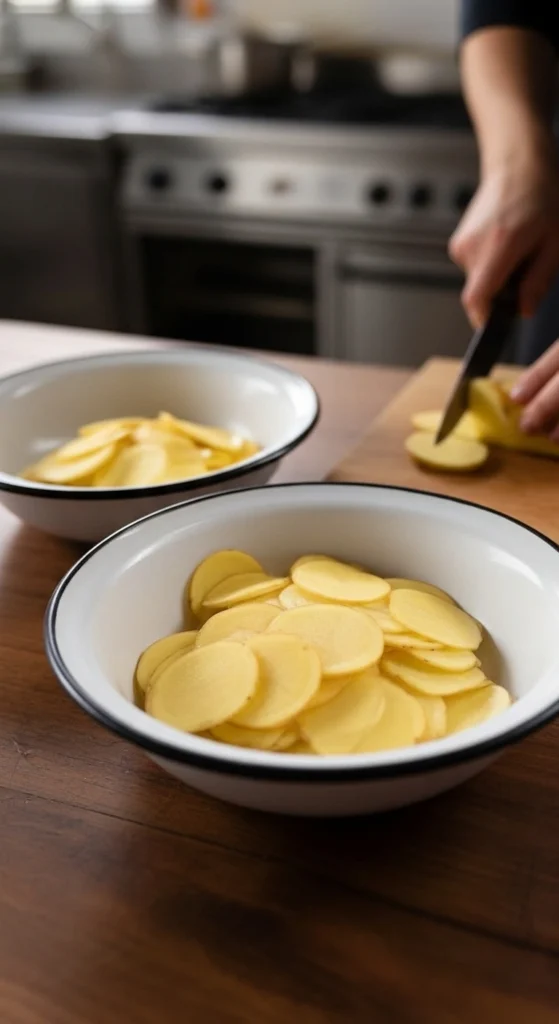 Étape 1 – Couper les pommes de terre :À l’aide d’une mandoline ou d’un couteau bien aiguisé, découpez les pommes de terre en fines rondelles.