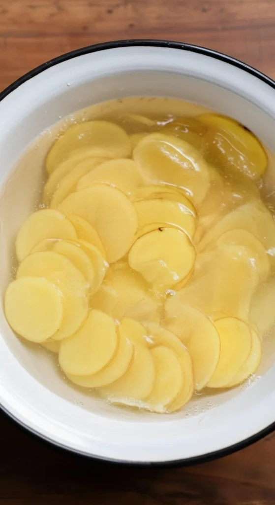 Étape 2 – Trempage : Placez les rondelles de pommes de terre dans un grand saladier et recouvrez-les d’eau froide. Laissez-les tremper pendant 10 minutes. Égouttez ensuite les pommes de terre, disposez-les sur du papier absorbant et séchez-les soigneusement.