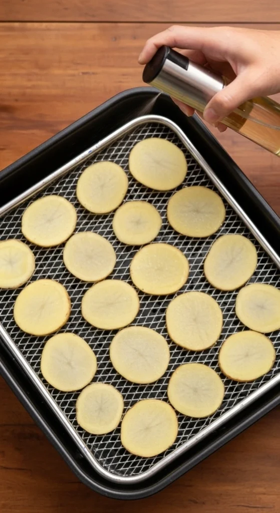 Étape 3 – Disposer : Vaporisez le panier de la friteuse à air avec un spray de cuisson, puis disposez une couche unique de rondelles de pommes de terre à l’intérieur.
