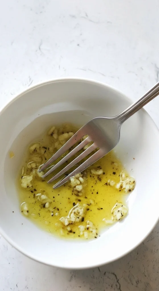 Faites fondre le beurre dans un petit bol. Cela prend environ 15 secondes au micro-ondes. Ajoutez le sel, le poivre noir fraîchement moulu et le jus de citron. Incorporez l’ail haché ou émincé, puis mélangez bien.
