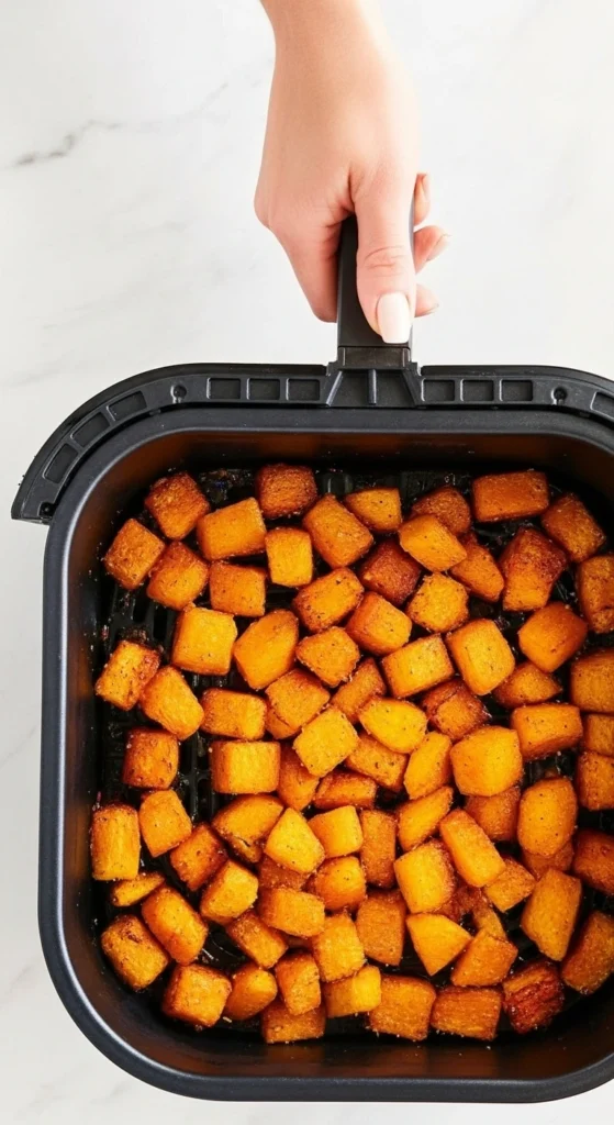 Avec la friteuse à air, la cuisson est bien plus rapide que la version rôtie au four, tout en donnant des cubes de butternut parfaitement tendres et caramélisés.