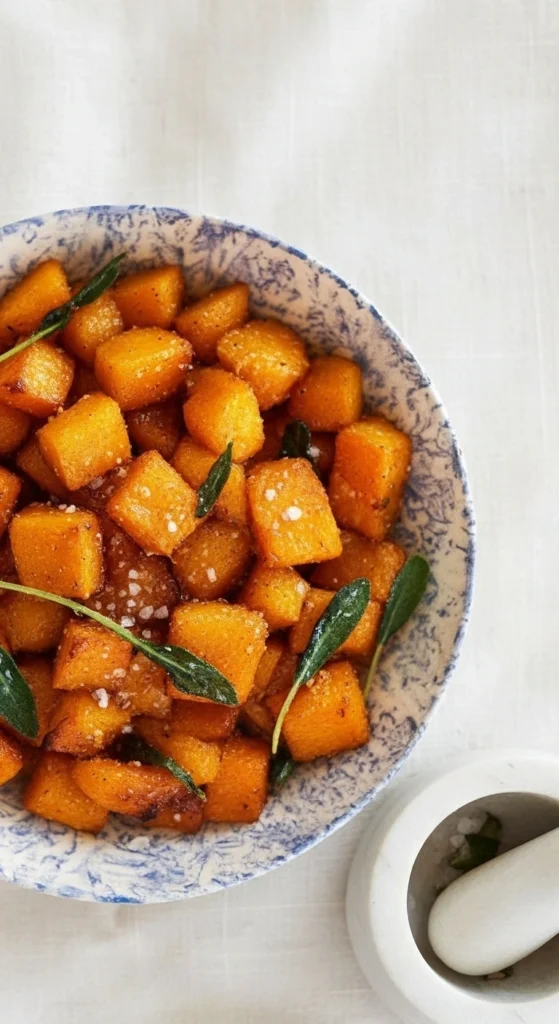 • Cuisson à la friteuse à air : disposez la courge assaisonnée dans le panier de la friteuse en une seule couche, puis faites cuire 20 à 25 minutes à 190 °C (375 °F), en mélangeant à mi-cuisson, jusqu’à ce que la chair soit tendre et légèrement caramélisée sur les bords. Retirez de la friteuse et servez. J’ai ajouté des feuilles de sauge croustillantes frites en garniture, mais du persil frais ciselé fonctionne également très bien.