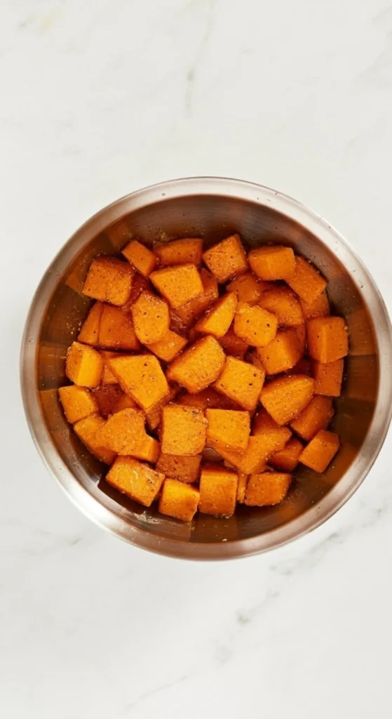 • Assaisonner : placez les cubes de butternut dans un grand bol, ajoutez l’huile et les épices, puis mélangez pour bien enrober chaque morceau.