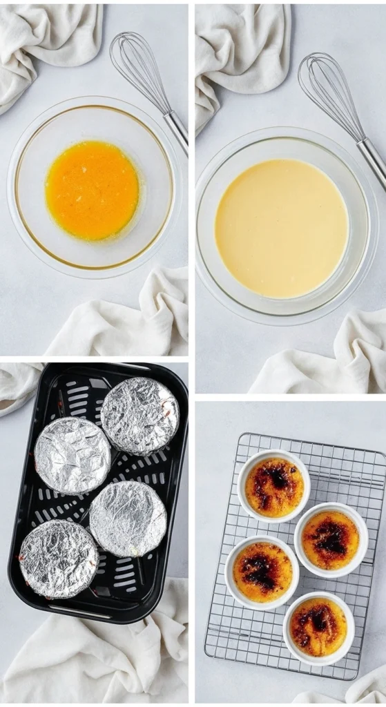 Faites cuire la crème. Répartissez la préparation dans des ramequins ou des petits pots à crème, couvrez-les de papier aluminium, puis faites-les cuire dans la friteuse à air (Air Fryer) pendant environ 25 minutes à 150 °C.