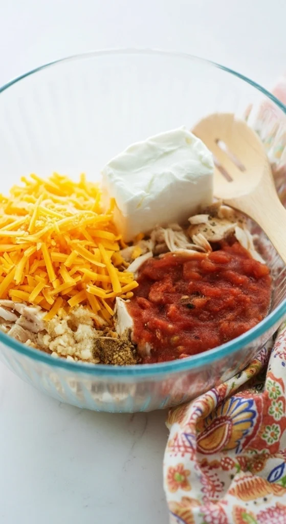 - Ajoutez ensuite le cheddar râpé, le fromage à la crème, la salsa et l’ail. Mélangez soigneusement jusqu’à obtenir une farce homogène et crémeuse.