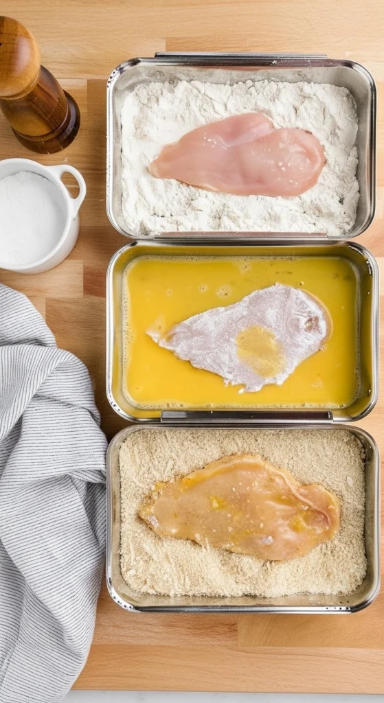 Pour la panure du Poulet Milanese, préparez trois assiettes ou plateaux séparés :