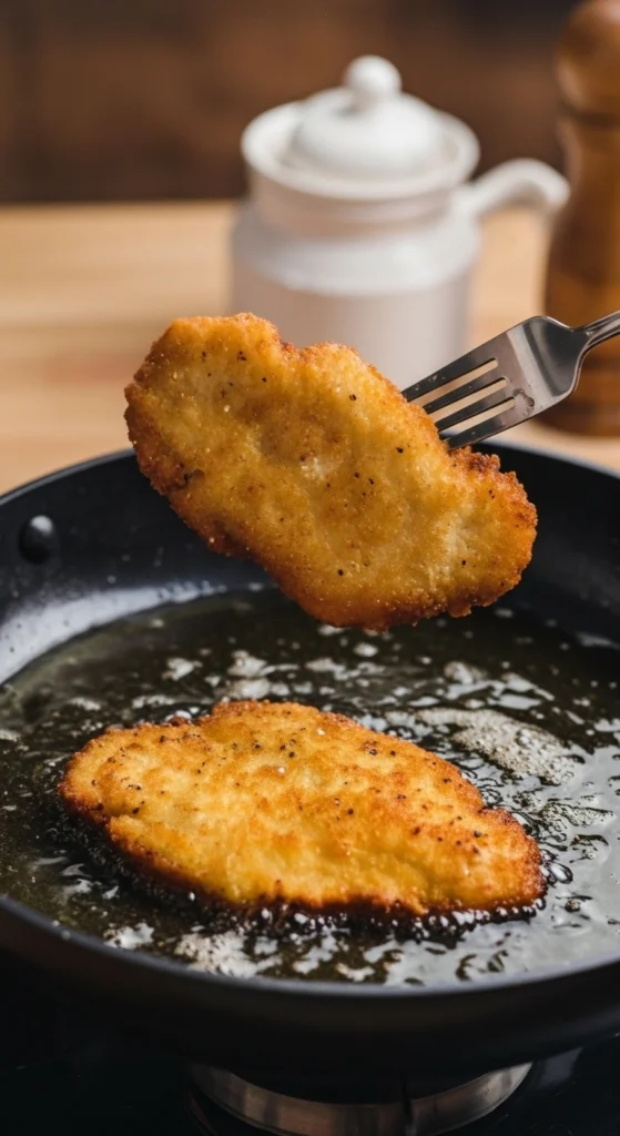 Faites chauffer environ 6 mm (¼ de pouce) de la matière grasse choisie dans la poêle à feu moyen. Faites frire les escalopes pendant 3 à 4 minutes de chaque côté, jusqu’à ce que le poulet soit bien cuit (75 °C à cœur) et que la panure soit dorée et croustillante.