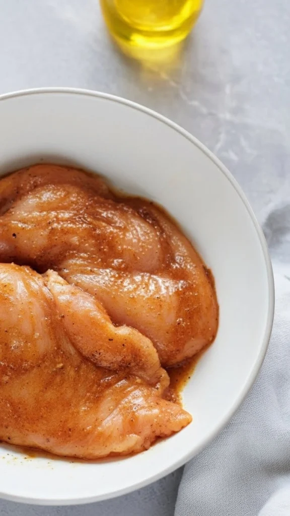 - Étape 1 : Séchez les filets de poulet avec du papier absorbant, placez-les dans un bol et frottez chaque filet avec un peu d’huile d’olive. Mélangez les épices dans un bol séparé, puis répartissez-les uniformément sur les deux faces des filets.