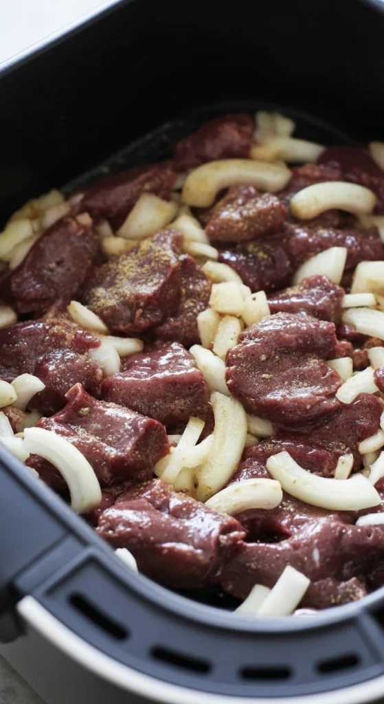 - Émincez les oignons et placez-les dans le panier de la friteuse à air (Air Fryer). Ajoutez les morceaux de foie, puis assaisonnez avec le sel, le poivre et l’ail en poudre. Vaporisez légèrement d’huile d’olive et mélangez délicatement pour bien enrober.