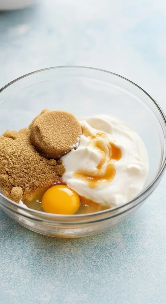 - Étape 3 : Ajoutez la cassonade, l’huile, l’œuf, le yaourt et la vanille.
