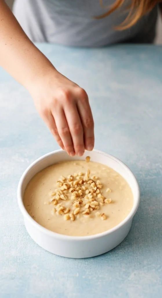 - Transférez la pâte dans le moule préparé, lissez la surface et parsemez de noix concassées.