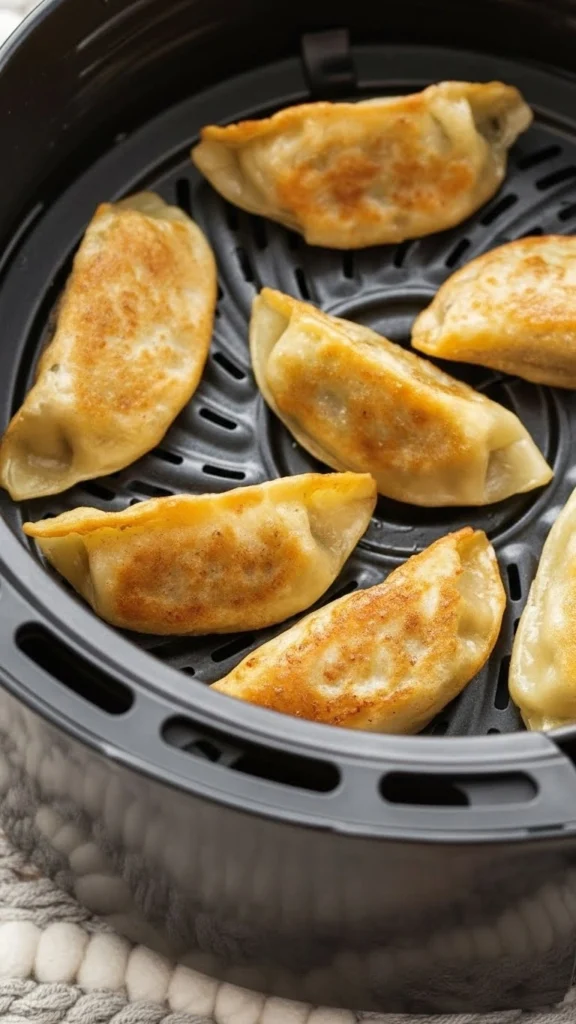 - Étape 3 – Cuisson à l’Air Fryer.Badigeonnez légèrement l’extérieur des gyoza avec de l’eau. Placez-les dans le panier de la friteuse à air (Air Fryer) et faites cuire 6 à 7 minutes, en les retournant plusieurs fois pour une cuisson uniforme.
