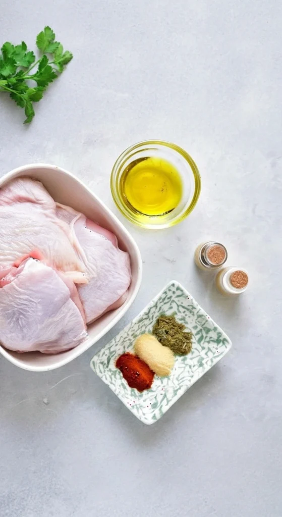 - Assaisonnements. Je privilégie la simplicité avec du sel, du poivre noir, de l’ail en poudre, de l’oignon en poudre, du paprika fumé et des herbes italiennes. Ce mélange peut paraître basique, mais il met parfaitement en valeur la saveur naturelle des hauts de cuisse de poulet à l’Air Fryer.