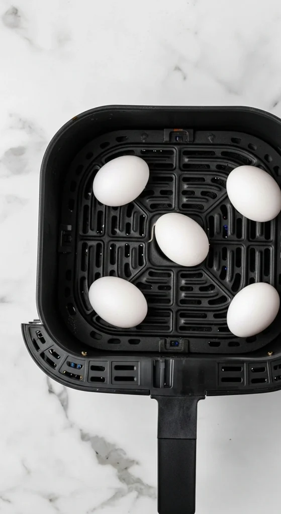 - ÉTAPE 2 : Une fois chaude, placez les œufs dans le panier ou sur la grille de la friteuse.