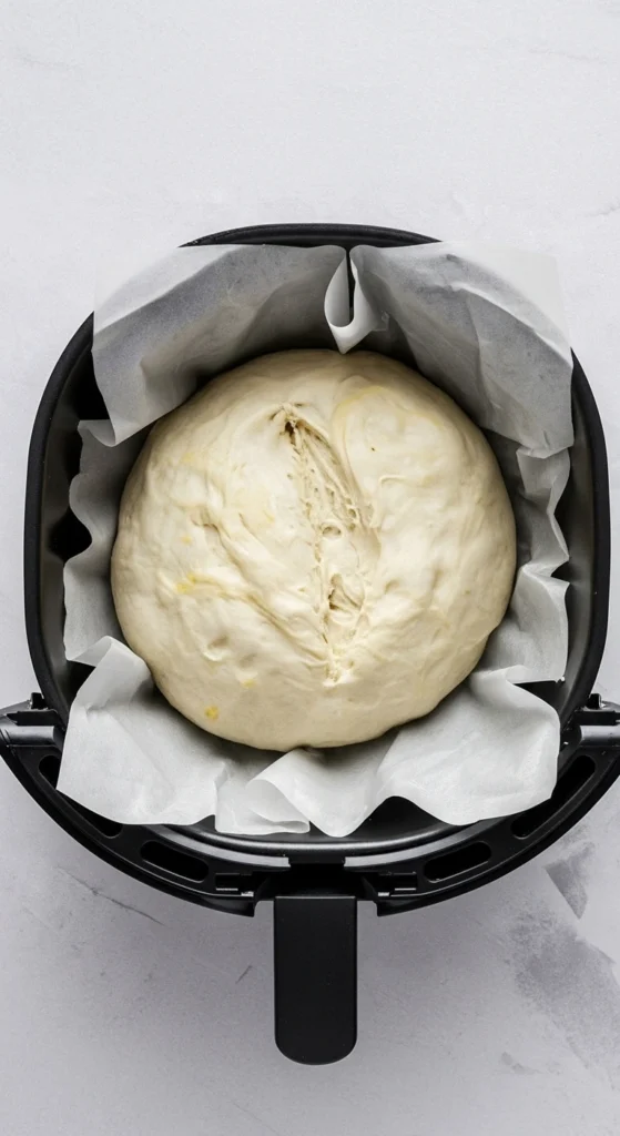 Étape 6 : Transférez délicatement le papier cuisson et la pâte dans le panier chaud de la friteuse à air. Faites cuire.