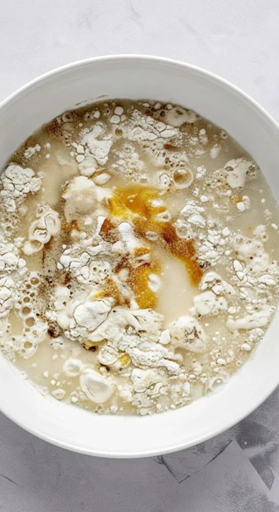 Étape 1 : Dans un grand saladier, mélangez la farine, la levure, le sel, l’eau tiède, l’huile d’olive et le miel.