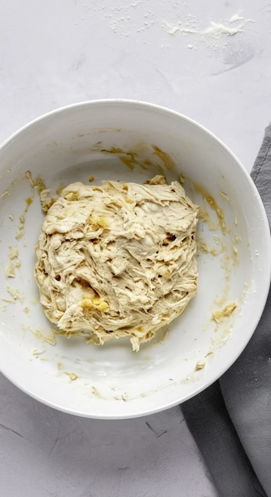 Étape 2 : À l’aide d’une spatule en caoutchouc ou d’une cuillère en bois, mélangez jusqu’à obtenir une pâte légèrement hirsute et collante.