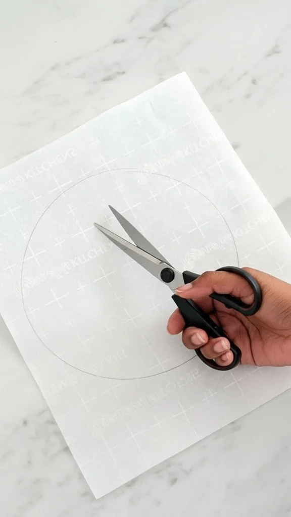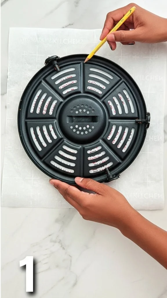 - Étape 1 — Commence avec une feuille de papier cuisson. Pose l’insert ou le panier de ta friteuse à air dessus, puis trace son contour avec un crayon.