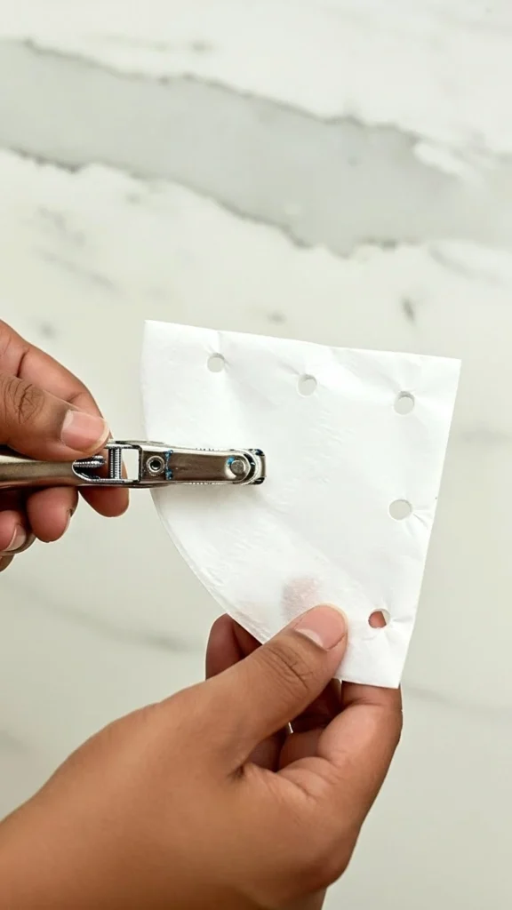 Découpez une feuille à la taille du panier, pliez-la en quatre, puis percez plusieurs trous espacés avec une perforatrice. Dépliez : c’est prêt.