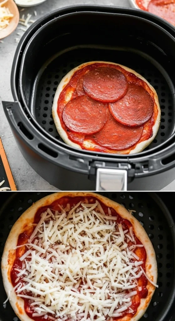 - Cuisson d’une pizza surgelée à l’Air Fryer : Préchauffez la friteuse à air à 185 °C. Faites cuire la pizza surgelée pendant 6 à 8 minutes, jusqu’à ce que le fromage soit fondu et que la croûte soit croustillante.