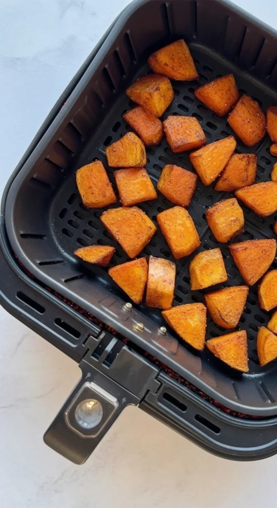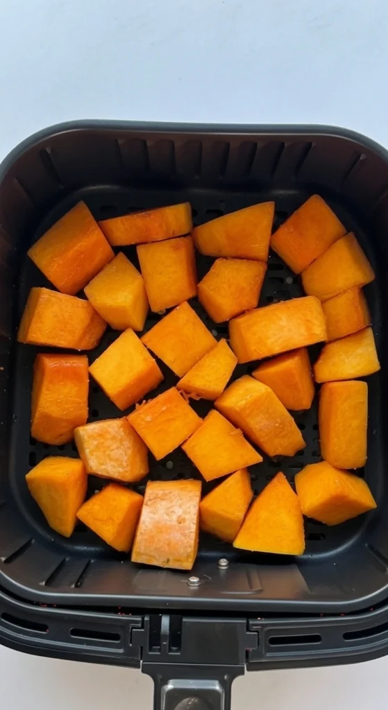 Pour une recette simple et rapide, je fais rôtir des morceaux de potiron dans la friteuse à air afin d’obtenir un accompagnement facile et sain. Cette même méthode fonctionne parfaitement avec des cubes de courge butternut.