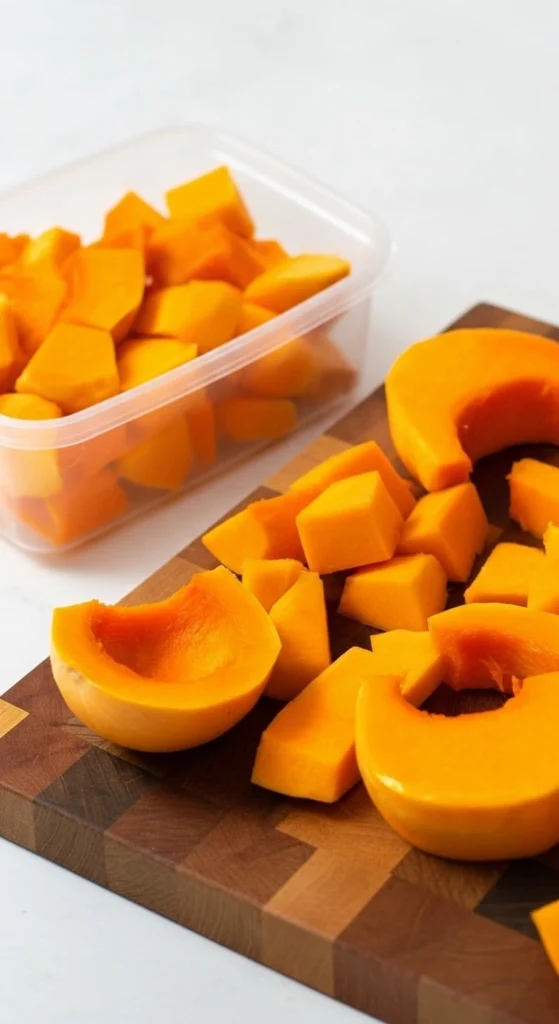 Pensez aussi à l’organisation des repas (meal prep) : vous pouvez couper le potiron à l’avance et le conserver. Je le détaille en cubes puis je le place dans une boîte hermétique au réfrigérateur pendant 4 à 5 jours. Il est ainsi prêt à être utilisé dès que nécessaire.