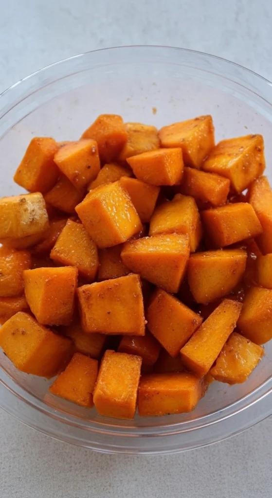 • Placez les cubes dans un bol, ajoutez l’huile d’avocat et les assaisonnements. Mélangez bien pour que chaque morceau soit uniformément enrobé.