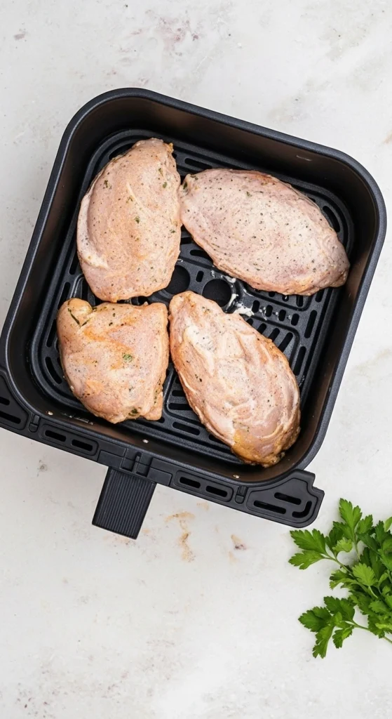 Étape 2 : Sortez le poulet de la marinade et disposez les morceaux en une seule couche dans le panier de la friteuse à air (Air Fryer), légèrement vaporisé d’huile.