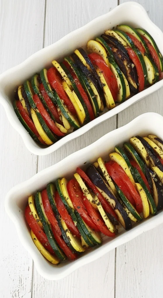 - Disposez les tranches de légumes sur la couche d’oignons et d’ail dans le plat. Alternez les légumes pour créer un joli motif en bandes. Vous pouvez les insérer verticalement ou les disposer en les chevauchant légèrement (selon la taille et la forme de votre plat).