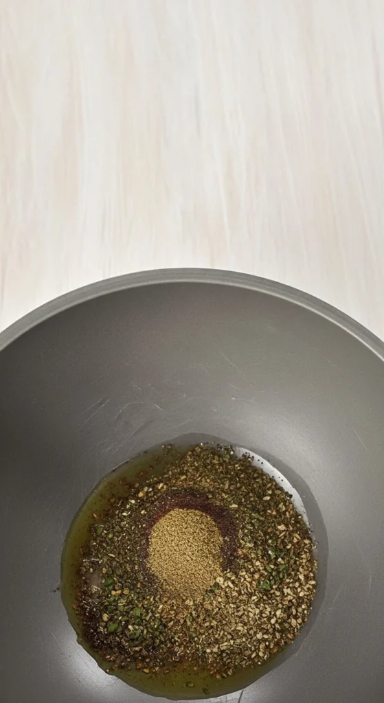 - Dans un saladier, mélangez l’huile d’olive, le sel, le poivre et les herbes. Mélangez bien.