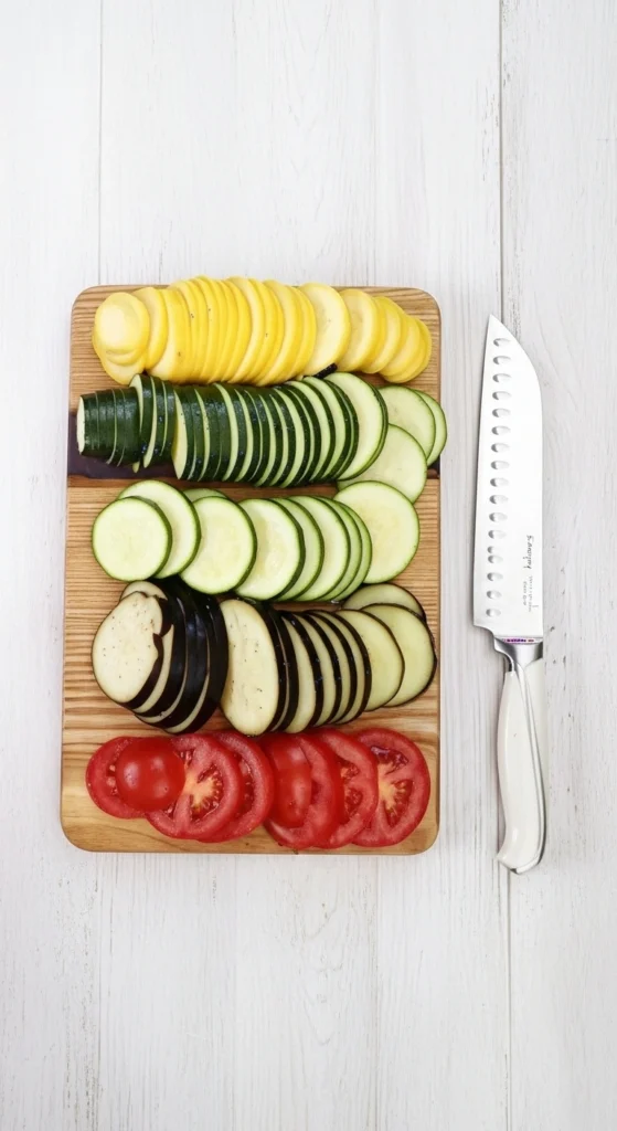 - Épluchez les légumes restants si vous le souhaitez (optionnel selon vos préférences). Coupez-les ensuite en tranches d’environ 0,5 cm d’épaisseur.1 petite aubergine, 1 petite courgette, 1 petite courge jaune (courge d’été), 1 grosse tomate