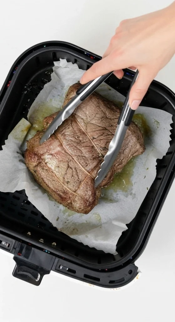 - Vous pouvez placer un revêtement ou papier cuisson au fond du panier de la friteuse (facultatif), puis disposez le bœuf dessus. Faites rôtir pendant 10 à 15 minutes : cette cuisson à haute température permet de former une belle croûte dorée tout en scellant les jus à l’intérieur — comme une saisie à la poêle avant la cuisson au four.