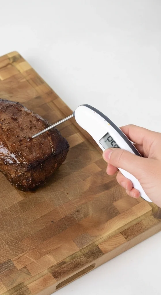 Commencez à vérifier la température interne à l’aide d’un thermomètre de cuisson à lecture instantanée, en insérant la sonde au cœur du morceau, dans la partie la plus épaisse. Gardez en tête que la température continuera à augmenter légèrement pendant le repos, donc anticipez ce facteur.