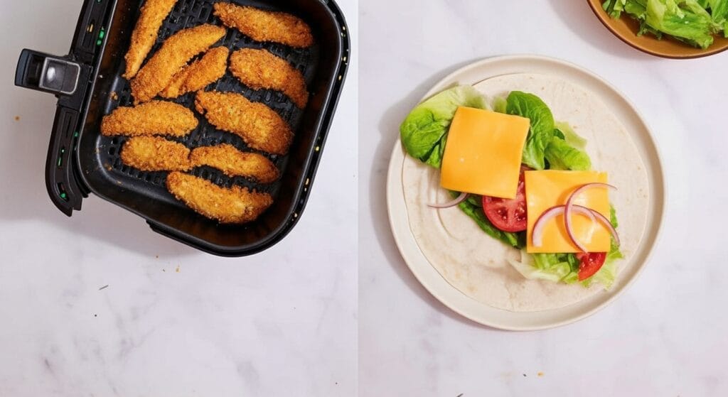 - Quand le poulet est bien doré et croustillant, assaisonnez généreusement avec du sel en flocons. Pendant ce temps, préparez votre wrap avec 1 grande tortilla, une couche de laitue, de tomate et d’oignon rouge, ainsi que 2 tranches de fromage, puis ajoutez quelques goujons de poulet croustillant.