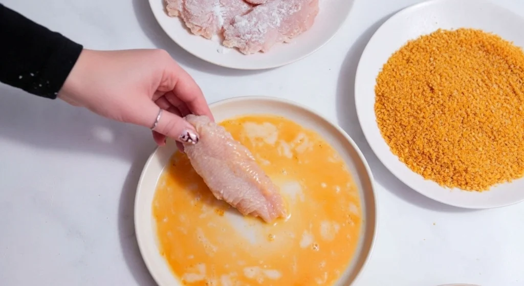 - Séchez les morceaux de poulet avec du papier absorbant. Un par un, enrobez-les d’abord de farine, puis trempez-les dans l’œuf.